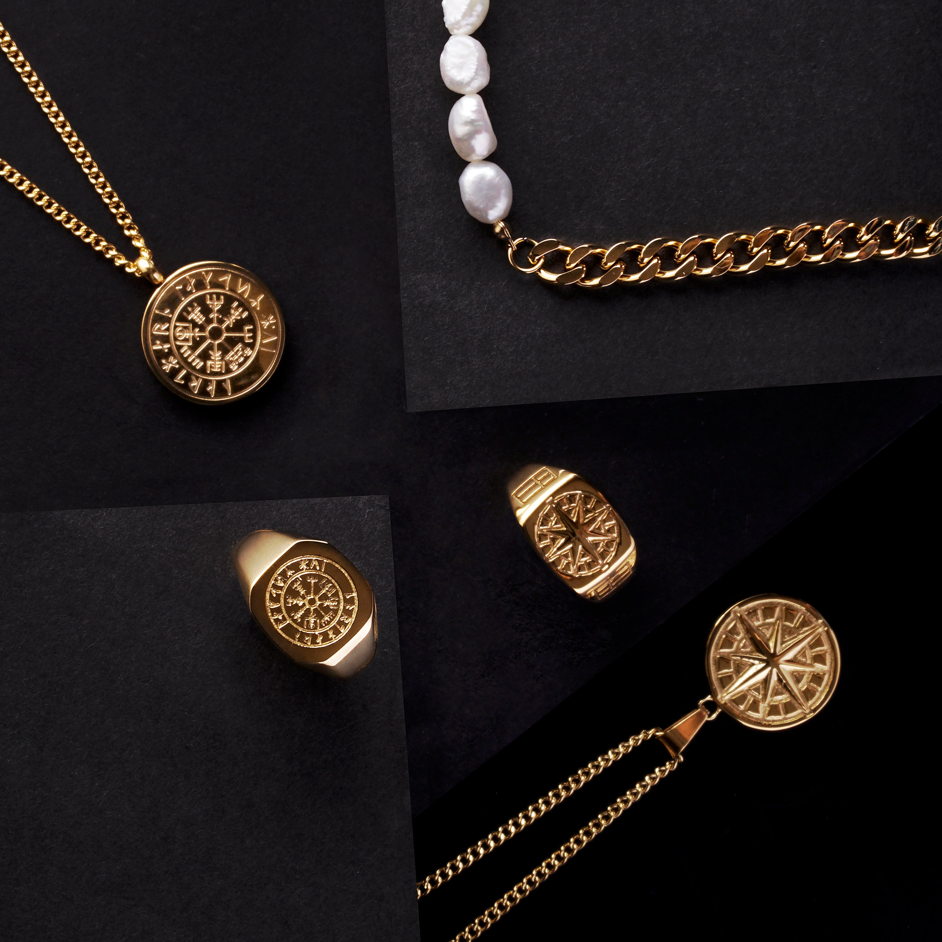 Vores kollektion af guld ringe spænder bredt. For dig, der vil have en klassisk signetring med kant, er vores Black Onyx Signature i guld det oplagte valg. En sort onyx-sten, der giver et råt og maskulint udtryk. Vil du have en ring med mere symbolik? Vores Compass Signature i guld er et symbol på retning og eventyr. For dig, der vil have et komplet look, er vores Vegvisir Siempre Bundle i guld et stærkt statement. Uanset hvad du vælger, får du en guld ring, der er bygget til at holde.